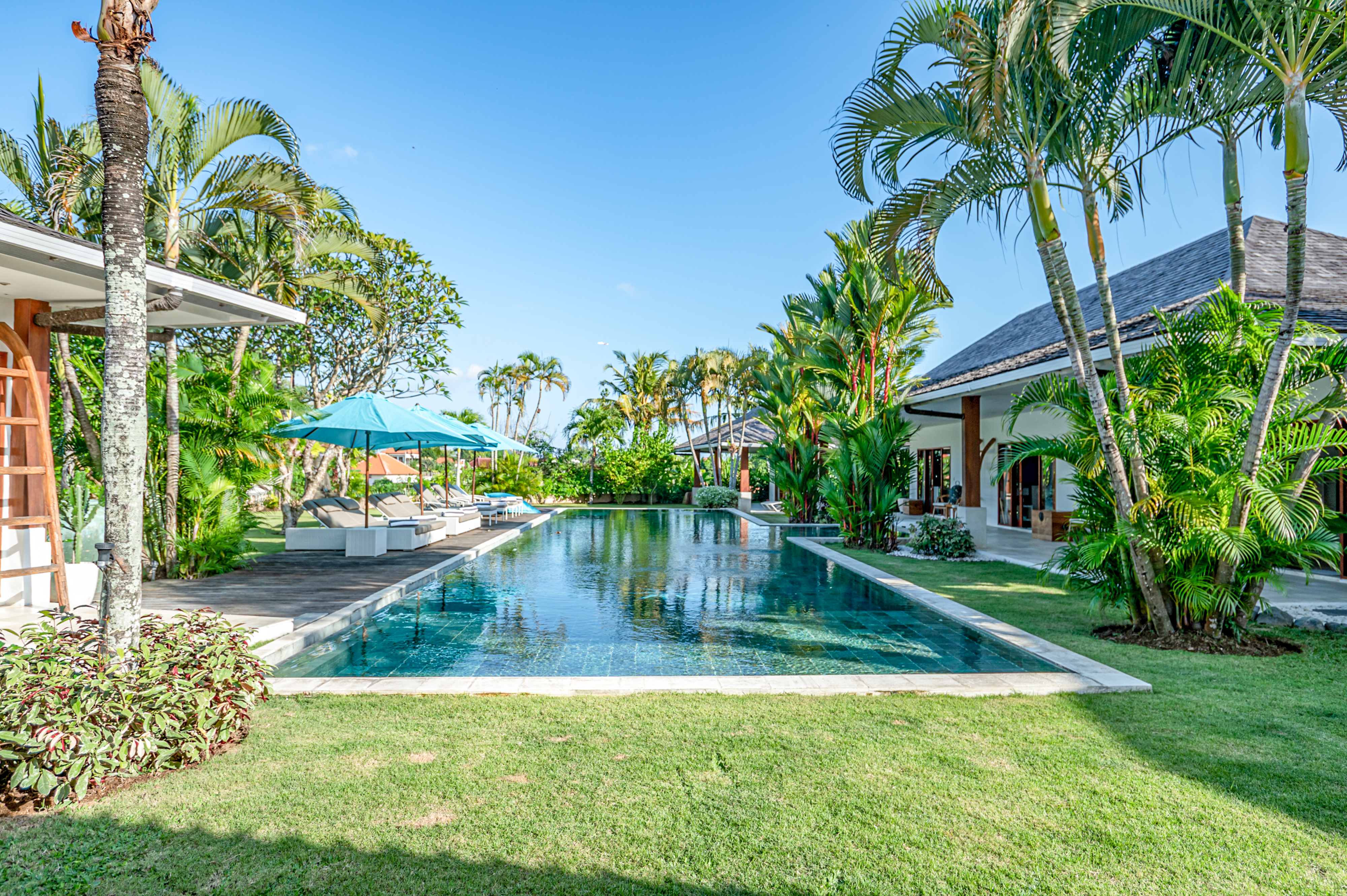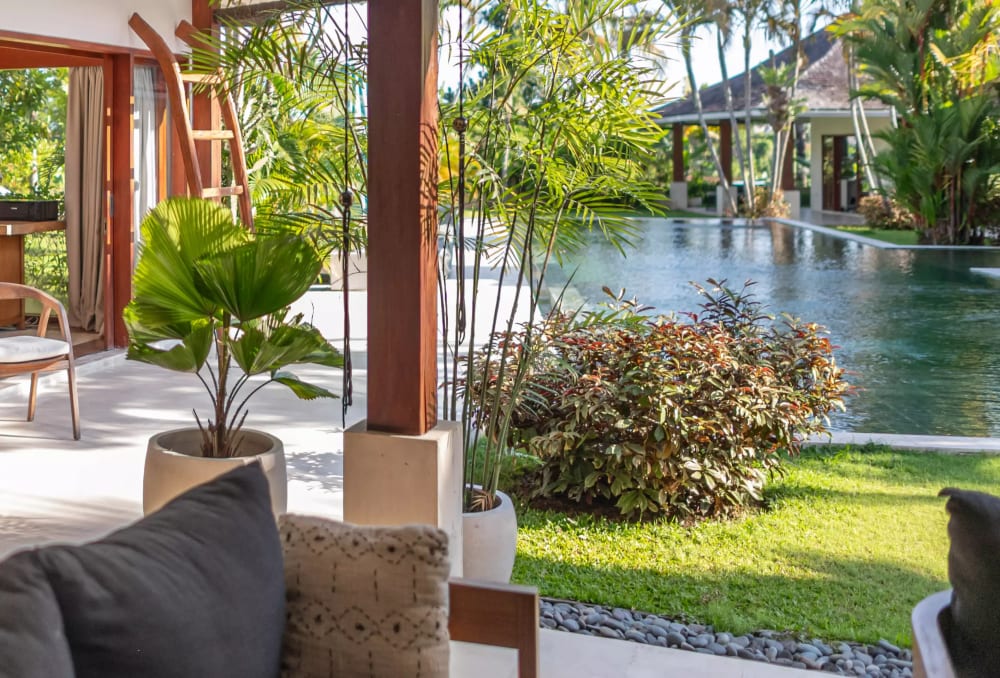 Villa Mimpi Nyata’s outdoor oasis features a 25‑metre pool, lush tropical gardens, sun loungers, and serene spaces designed for relaxed, resort‑style living.
