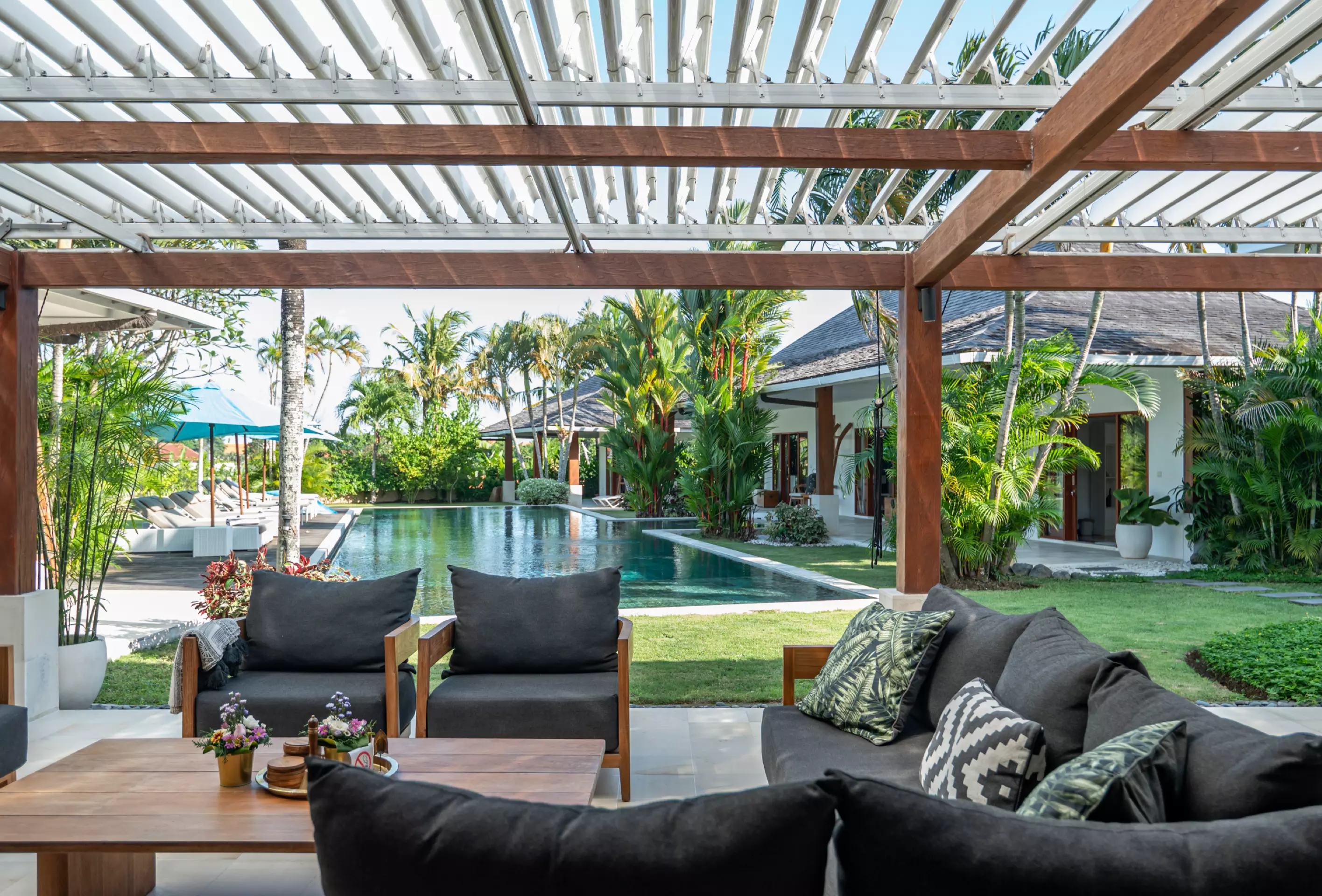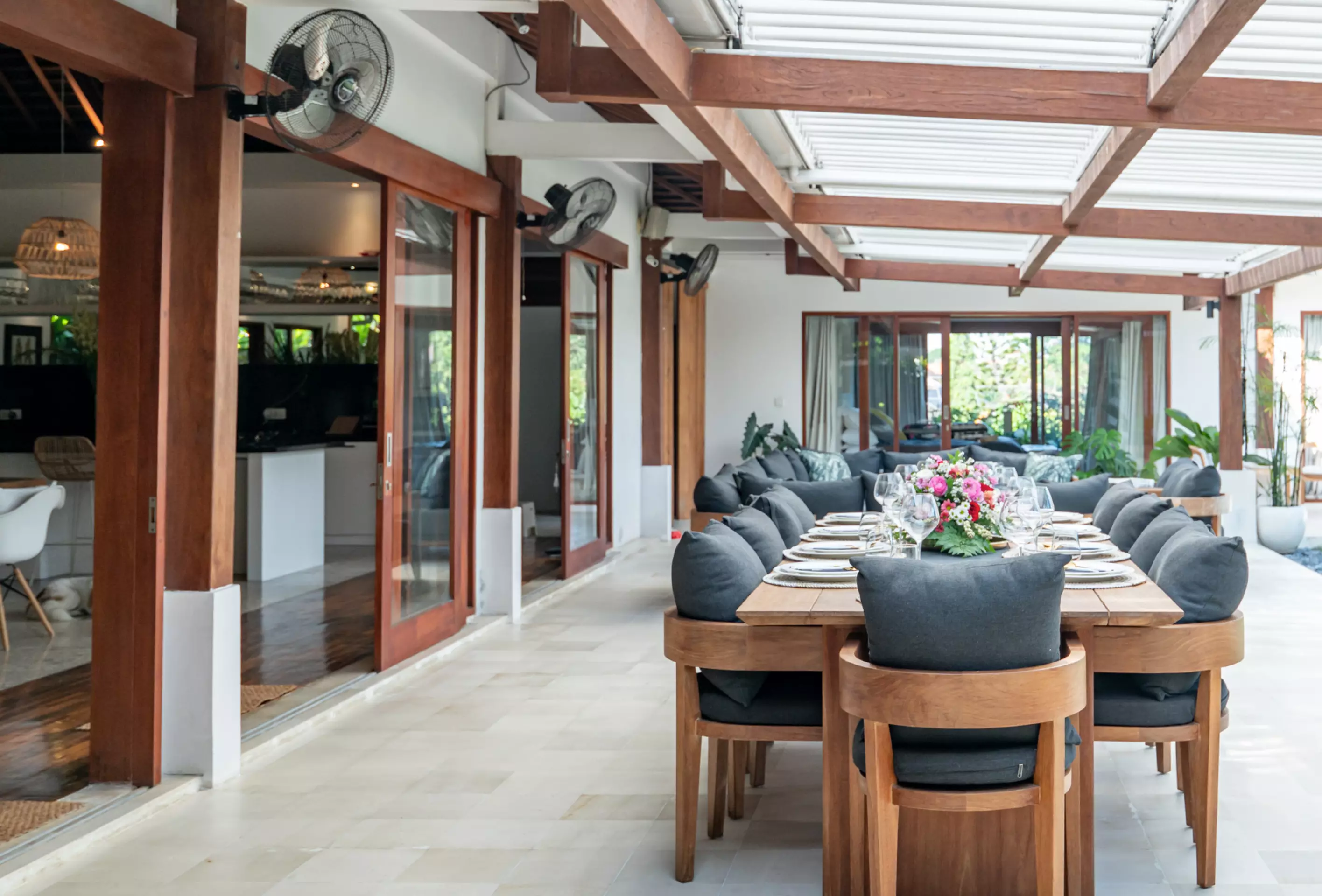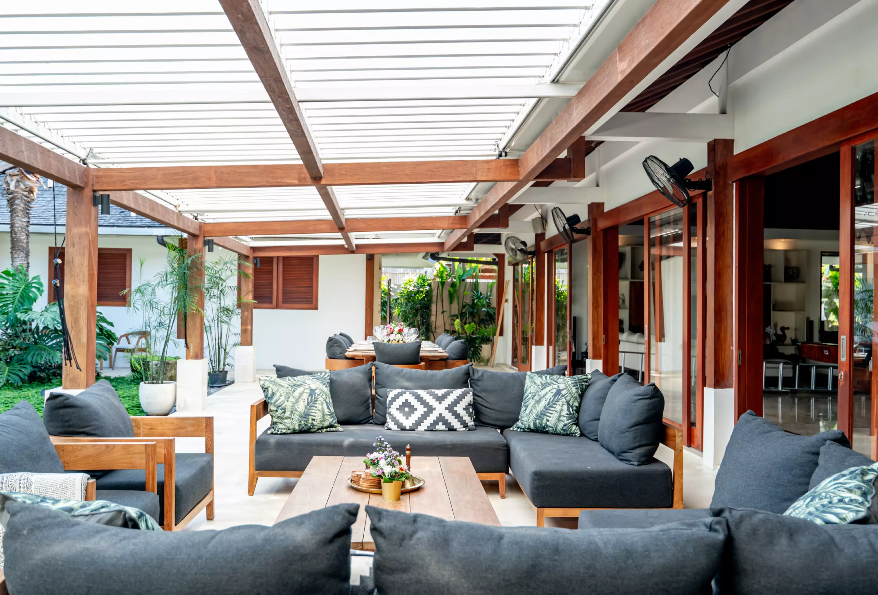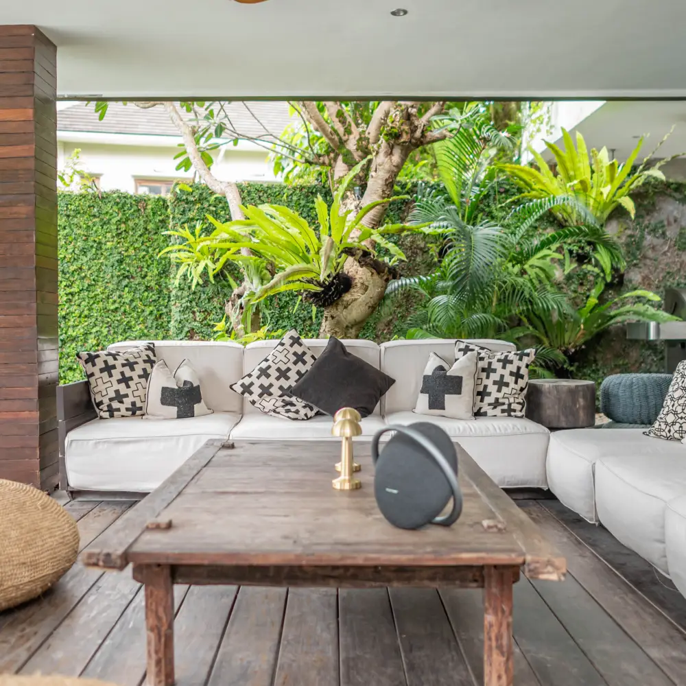 Villa Mimpi Nyata’s outdoor living area offers a spacious lounge to unwind and a separate alfresco dining space, perfect for relaxed tropical family gatherings.