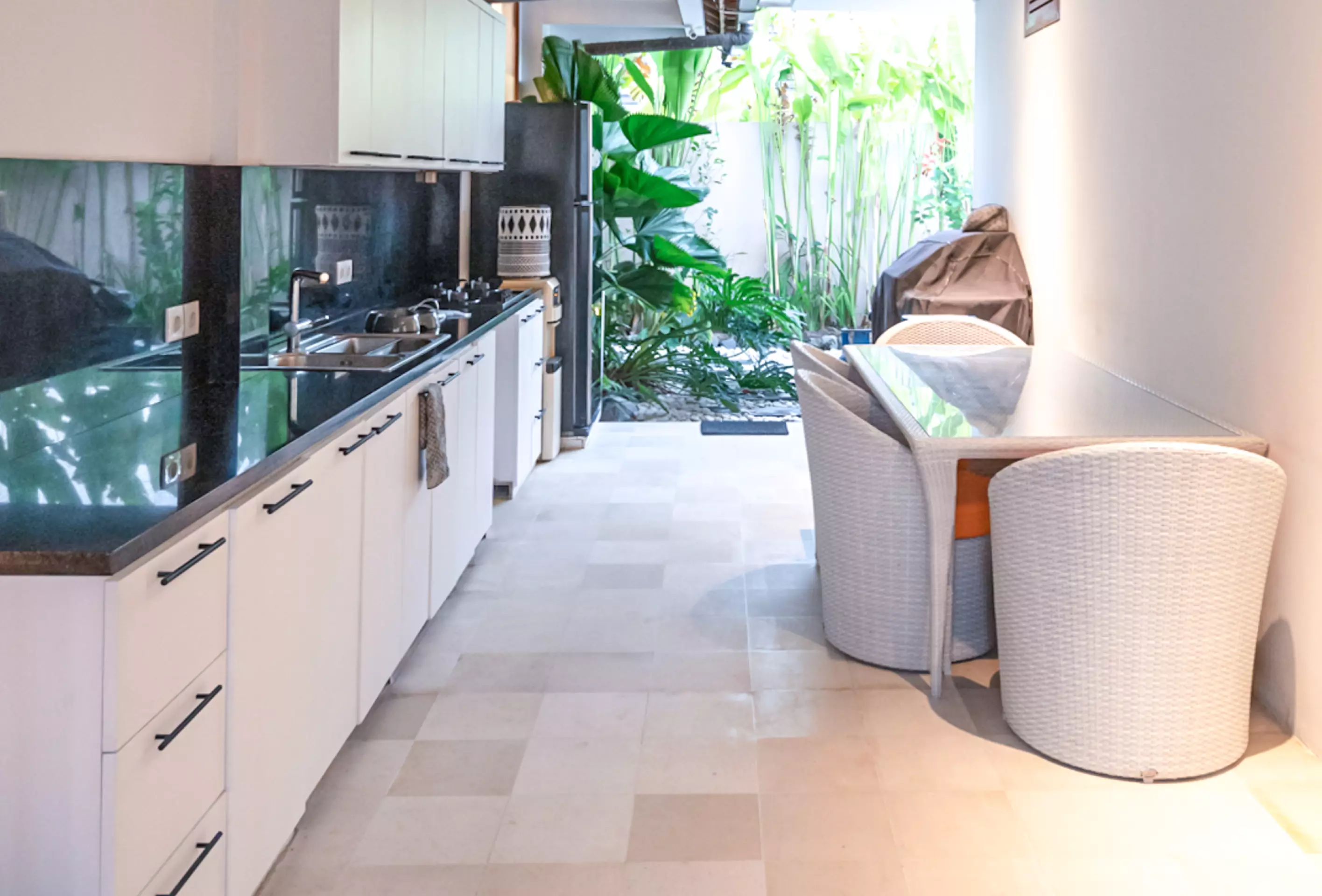 Villa Mimpi Nyata’s chef‑ready kitchen features quality appliances and spacious prep areas, with the option to book a private chef for effortless in‑villa dining, ideal for memorable family dinners.